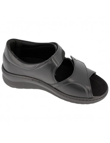 Chaussure en cuir souple avec une coupe très large et confortable, qui permet aux pieds de respirer sans les ne comprimer ni leur causer de douleur. La tige est entièrement réalisée dans un tissu souple et élastique qui ne comprime pas le pied mais procure bien-être et soulagement, tandis que le talon, en cuir, est renforcé pour offrir soutien et stabilité. La fermeture velcro augmente l'ouverture et facilite l'enfilage, tout en permettant un bon ajustement.